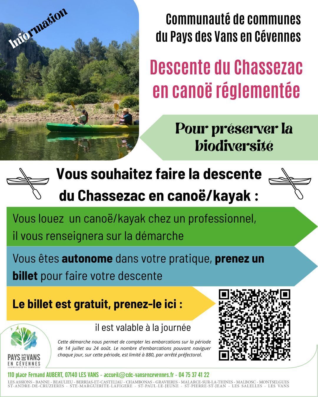 Pour préserver notre territoire d’exception, une politique de régulation de la fréquentation des canoés en haute saison est mise en place, du 14 juillet au 24 août 2025. La Préfecture de l’Ardèche, la Communauté de communes du Pays des Vans en Cévennes et les loueurs de canoës ont travaillé conjointement depuis 2022, afin de mettre en place ce projet de régulation, via l’instauration de quotas journaliers.