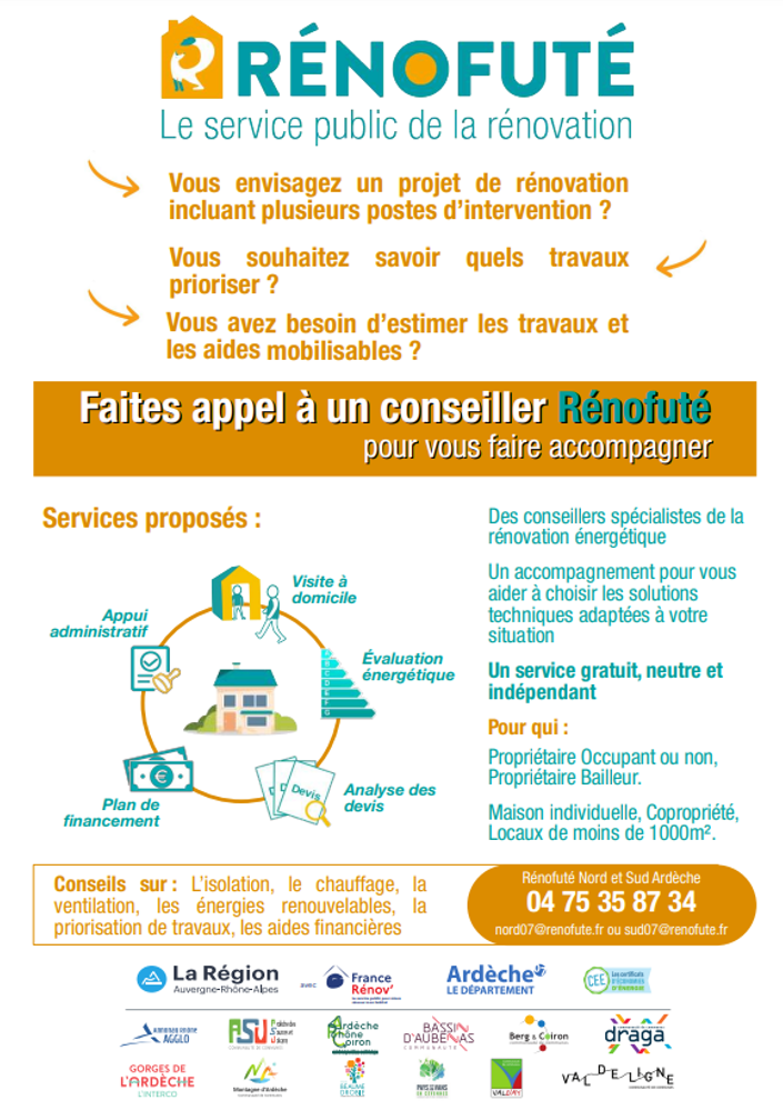 Les conseillers Rénofuté sont des spécialistes indépendants pour vous aider gratuitement à choisir les solutions techniques adaptées à la rénovation de votre logement ou de votre local et à identifier les aides financières dont vous pouvez éventuellement bénéficier. Porté par les collectivités Ardéchoises et membre du réseau France Renov’, Rénofuté est un service public, neutre, gratuit et indépendant. Isolation, chauffage, ventilation, production et économies d’énergie, choix des postes de travaux à réaliser, comparaison des devis, définition du budget, choix des entreprises : autant de questions auxquelles les conseillers peuvent vous aider à répondre.